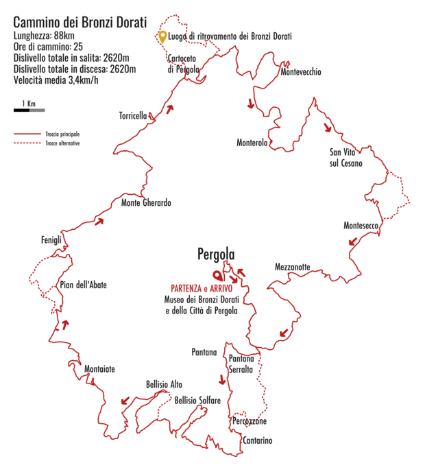 Il percorso è stato pensato per toccare la maggior parte delle frazioni di Pergola, oltre ad alcune dei comuni limitrofi.