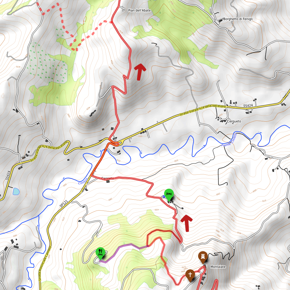 Once out of the woods, you will cross another gravel road leading to Fenigli. Checking the map, you will see that the main trail turns left. Although you can reach Fenigli by going straight and slightly shortening the trip, we recommend following the main itinerary: it offers scenic views and leads into the village via a more picturesque route.