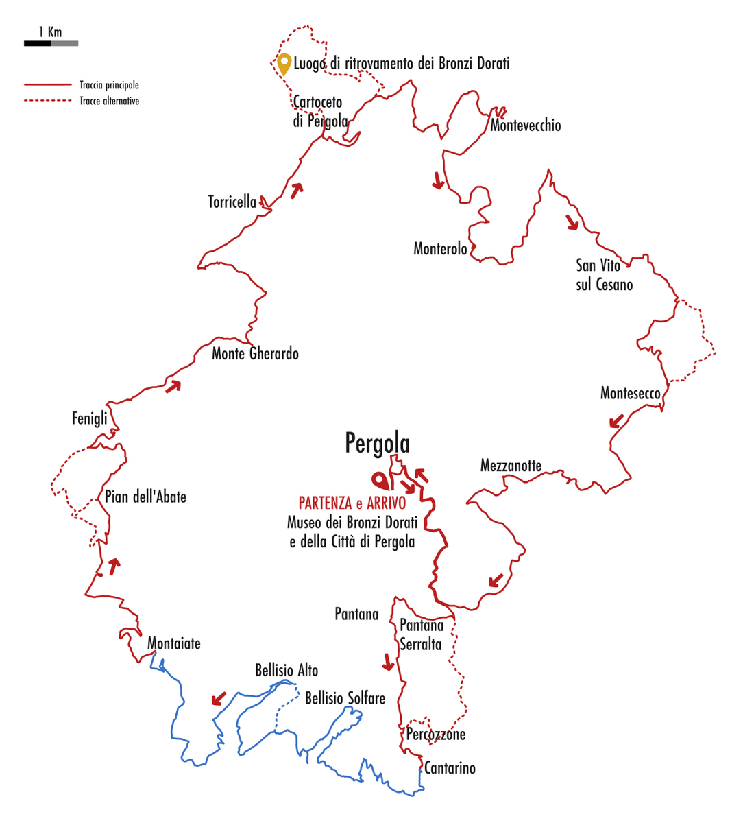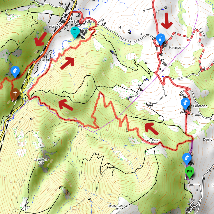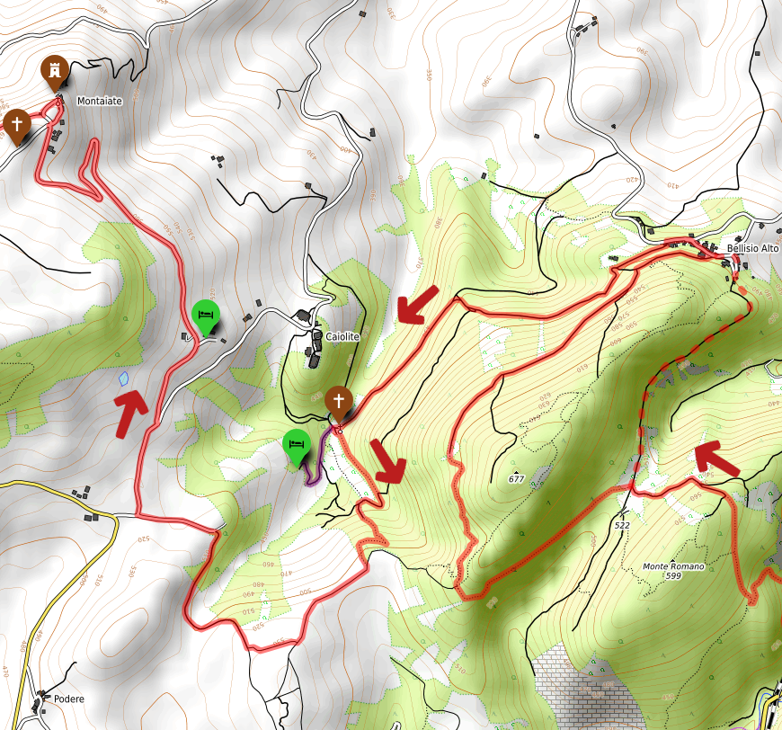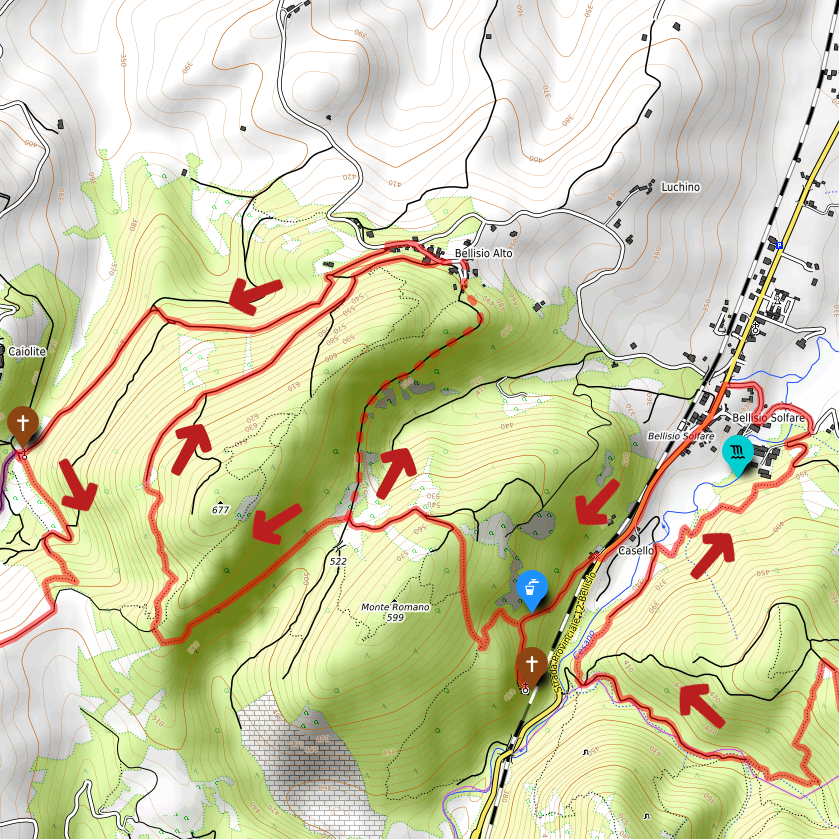 Per proseguire il cammino è necessario tornare indietro dal santuario (la strada finisce lì) di circa 100m e prendere il sentiero in salita sulla sinistra che ci condurrà verso il monte Romano e poi a Bellisio Alto, magnifico punto panoramico verso Pergola e la Valle del Cesano. Questo tratto consente anche di raggiungere Bellisio Alto per una stradina forestale alternativa che permette di accorciare leggermente il percorso (vedi traccia tratteggiata); il bivio è ben visibile perché si trova in mezzo ad un grande prato. La traccia principale è invece un sentiero che raggiunge un punto molto panoramico con vista verso il massiccio del Monte Catria e poi prosegue nel bosco, quindi consigliato in estate.
